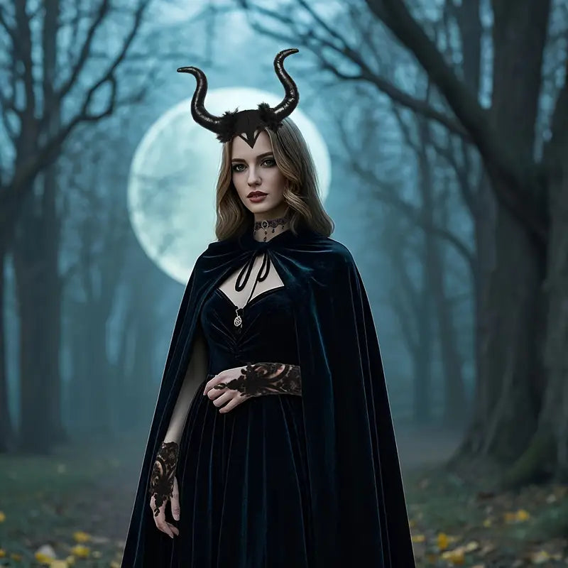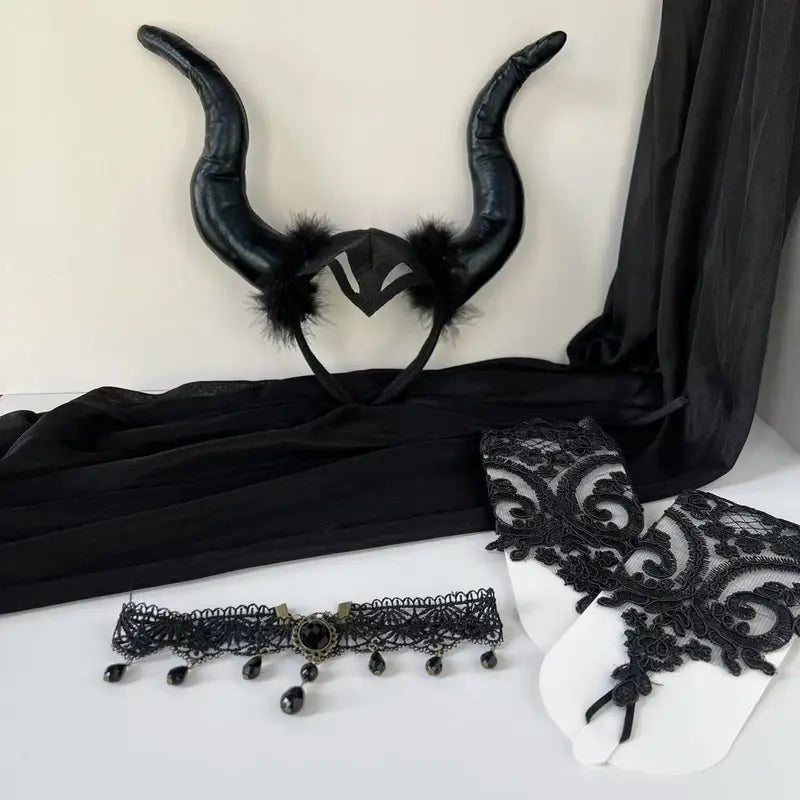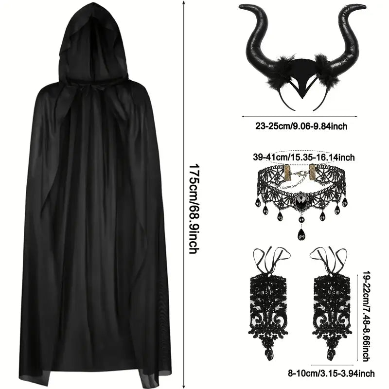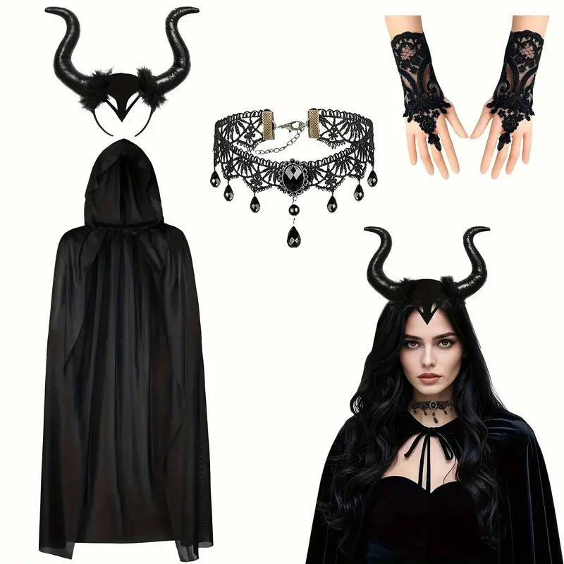 4pcs Halloween Devil Costume, Black Witch Cloak Witch Role Play Cloak, Halloween Devil Horn Headband Gothic Style Accessories and Lace Fingerless Gloves, Devil Queen Costume, Carnival Halloween Wizard Theme Party Accessories Set